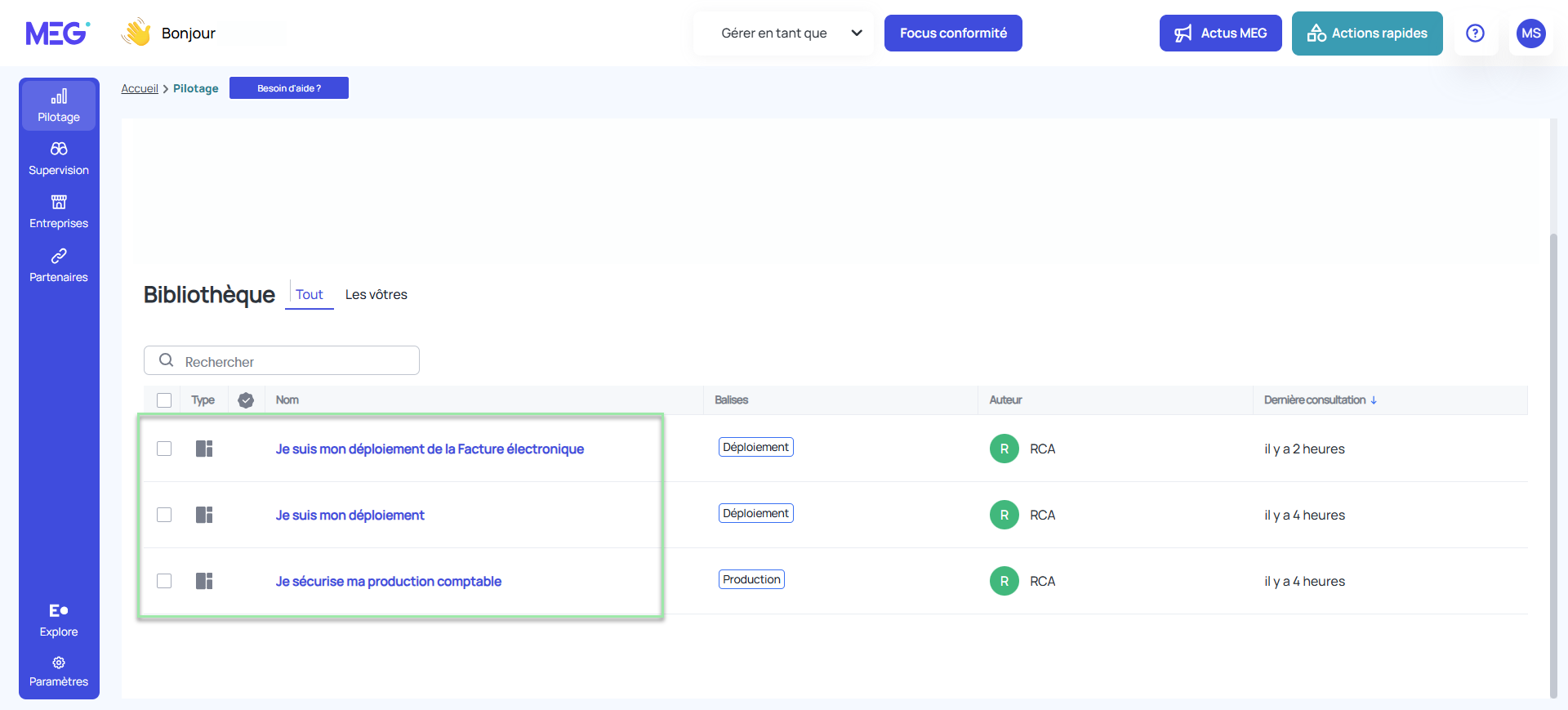 L’espace Pilotage Cabinet vous permet d’accéder à des Liveboards dédiés au suivi de votre activité cabinet, du déploiement des entreprises sur MEG et à la sécurisation de votre production comptable.