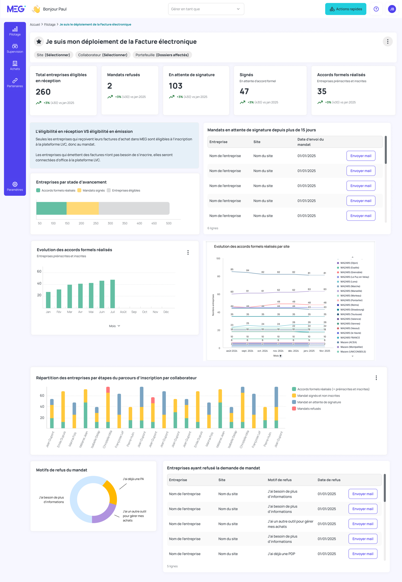 Suivez l’évolution des inscriptions de vos entreprises à la Plateforme Agréée LVC grâce à ce Liveboard, conçu spécifiquement pour vos dossiers MEG.