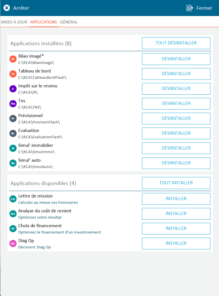 Infos : Pour désinstaller un logiciel, le chemin est le même que pour installer un logiciel comme vous pouvez le voir sur la capture d'écran (Mise à jour > Applications) Il faut tout de même noter que lorsque vous désinstaller un logiciel, celle-ci ne supprimera pas le fichier .ini du logiciel ni les dossiers et modèles personnalisés qui ont été enregistrés dans le répertoire par défaut du répertoire d'installation.
