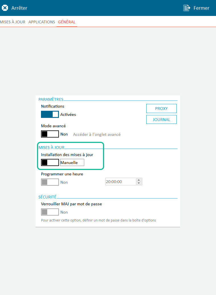 Ensuite il faut vous rendre dans l’onglet général puis passer l’option installation des mises à jour sur manuelle :