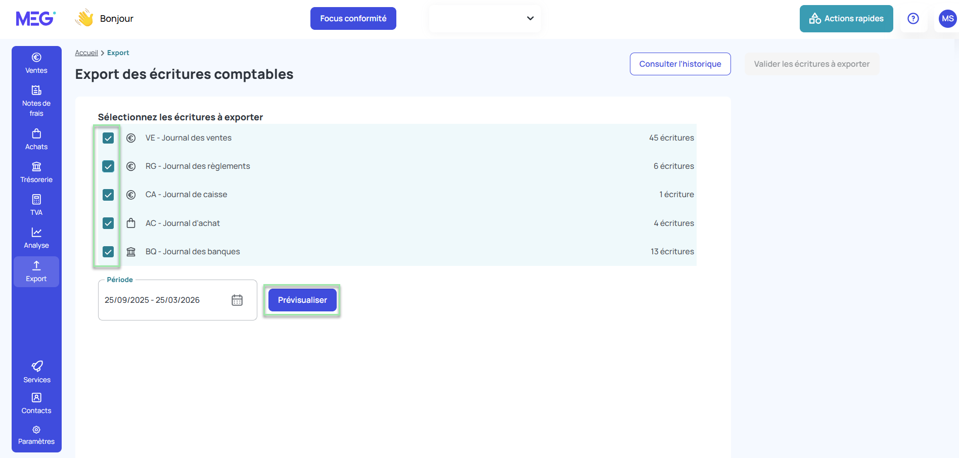 Les exports des écritures comptables sont centralisés sur la plateforme MEG. Tous les exports sont regroupés au même endroit pour faciliter l'export des écritures comptables.