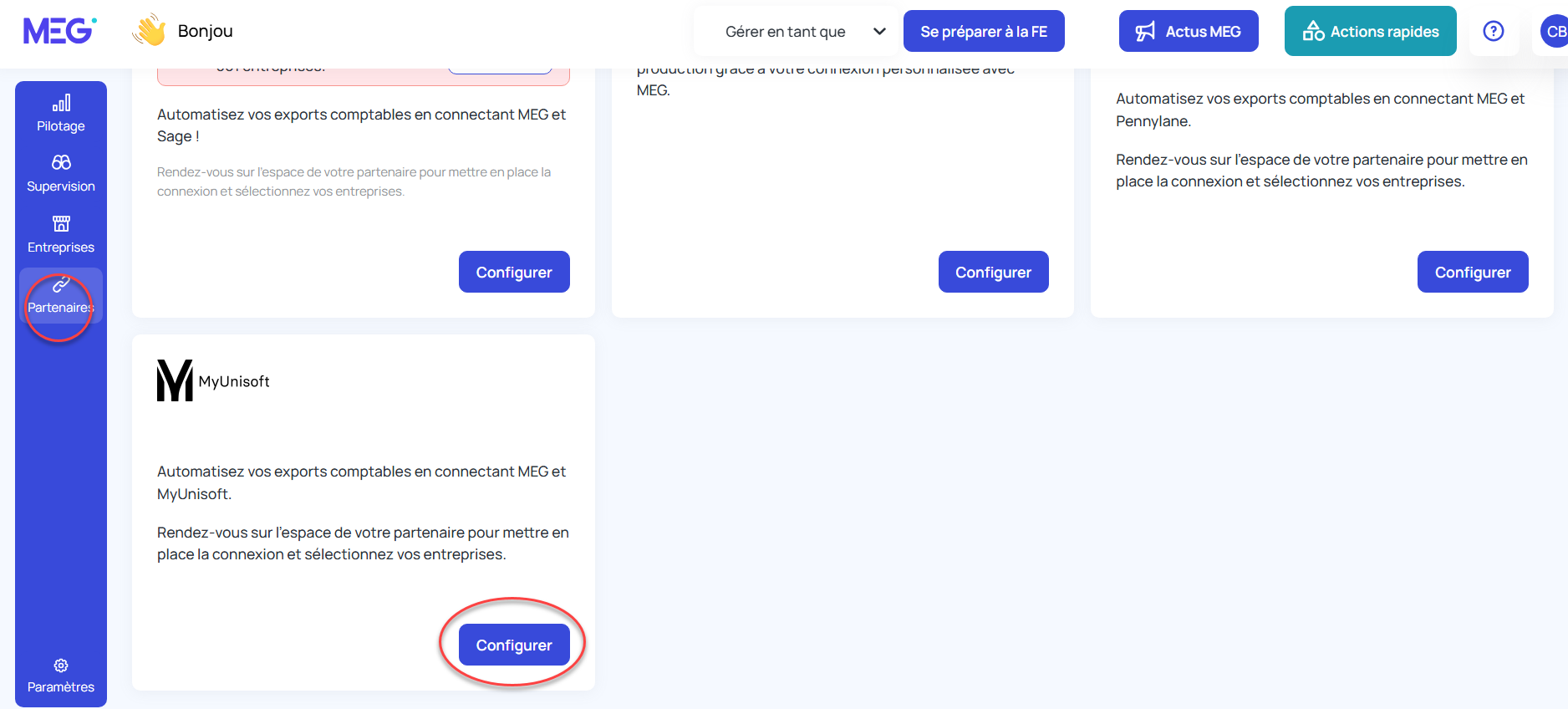 Depuis votre plateforme MEG, rendez vous sur l'onglet "Partenaires" à gauche de votre écran puis dans la tuile correspondante cliquez sur "Configurer".