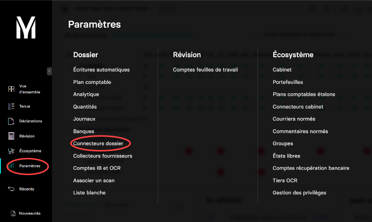 Depuis votre espace MyUnisoft, rendez vous dans "Paramètres" puis "Connecteur Dossiers"