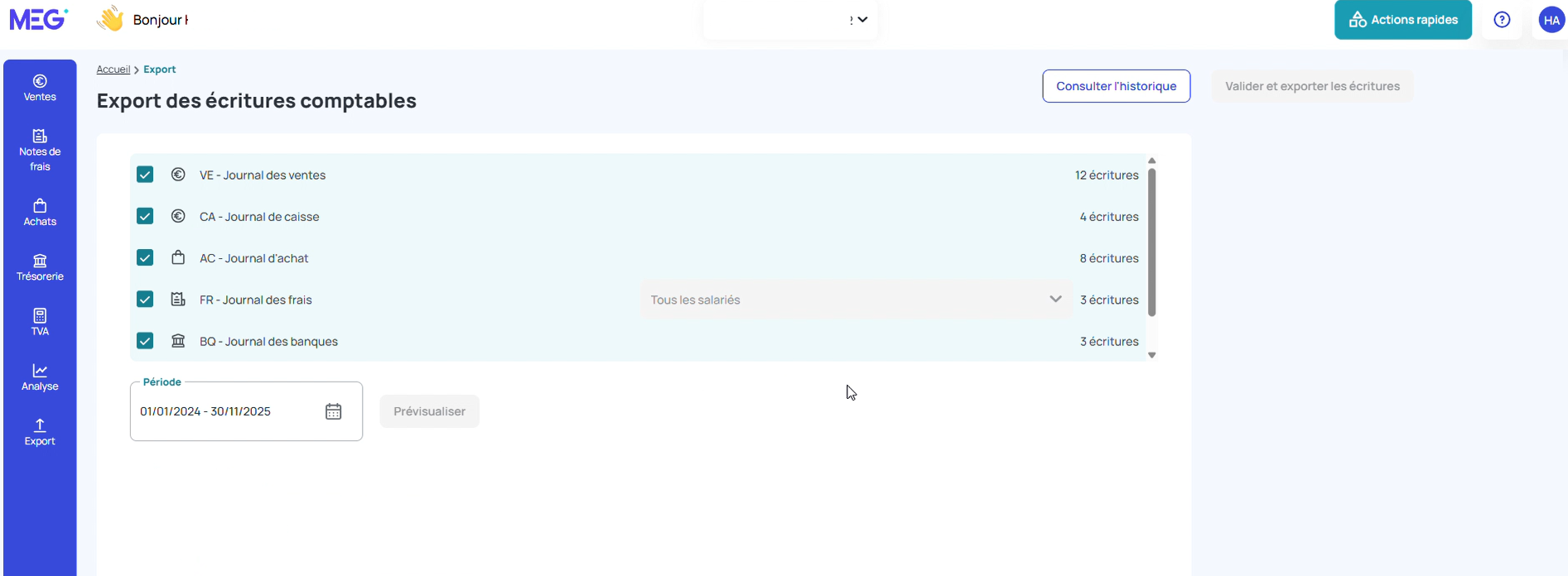 Sélectionnez les journaux à importer ainsi que la période désirée et cliquez sur le bouton "Valider et exporter les écritures"