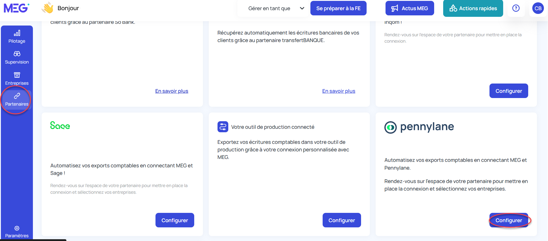 Depuis votre plateforme MEG, rendez vous sur l'onglet "Partenaires" à gauche de votre écran puis dans la tuile correspondante cliquez sur "Configurer".