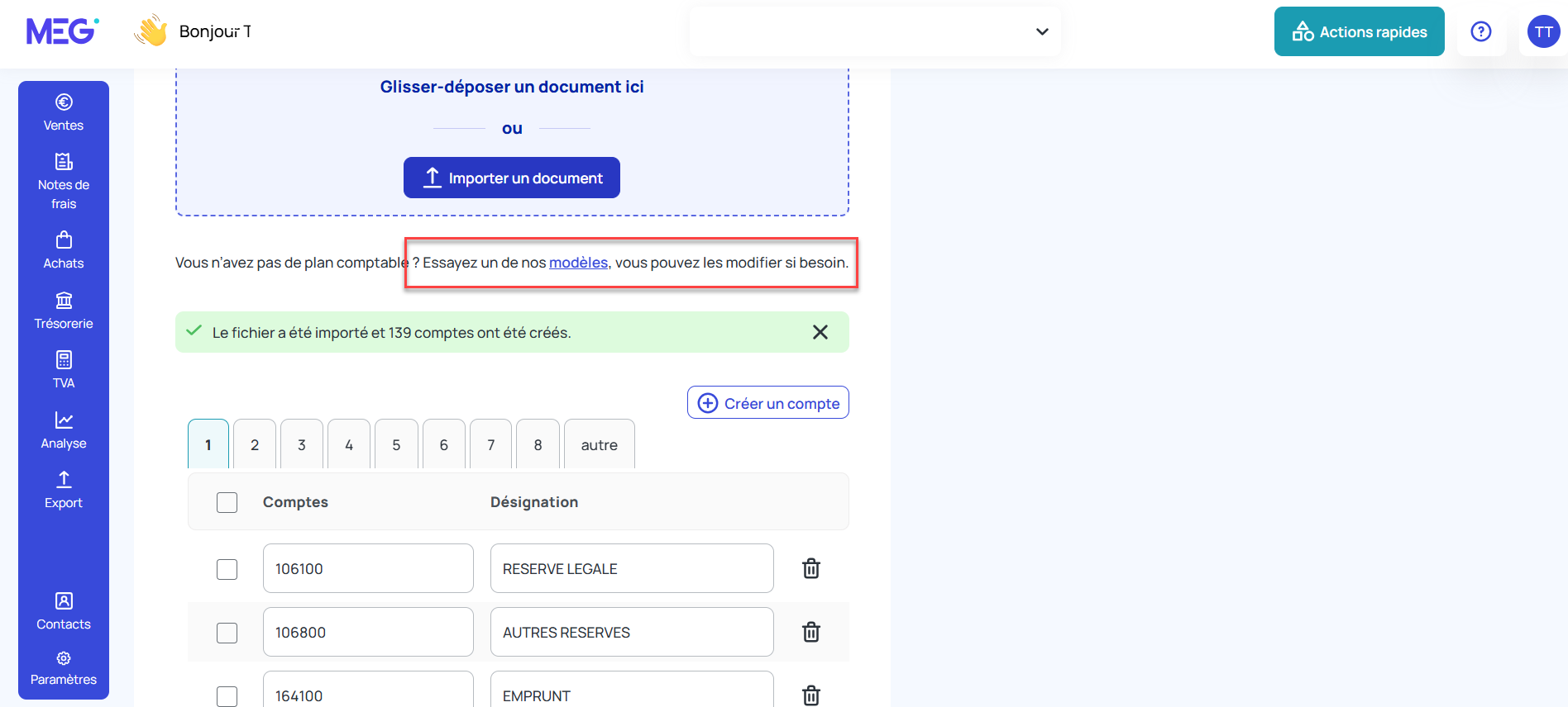 Si aucun compte existant ne correspond dans le plan comptable, un compte par défaut MEG est proposé.
