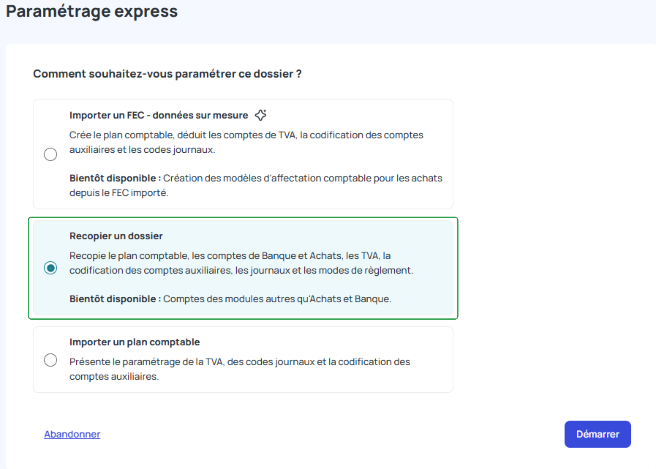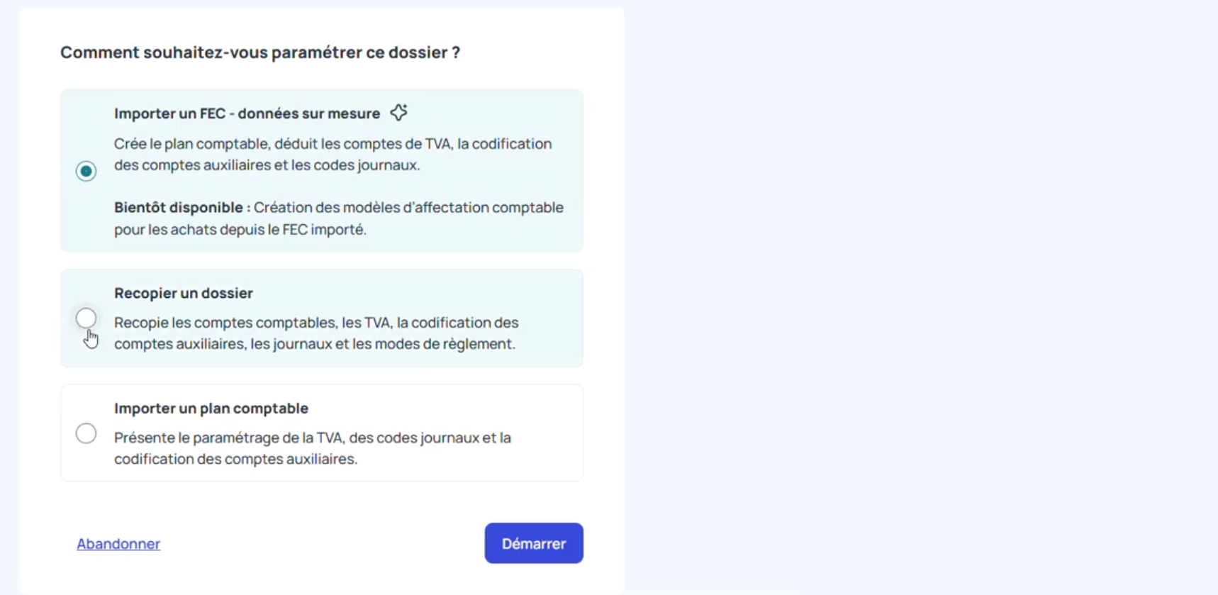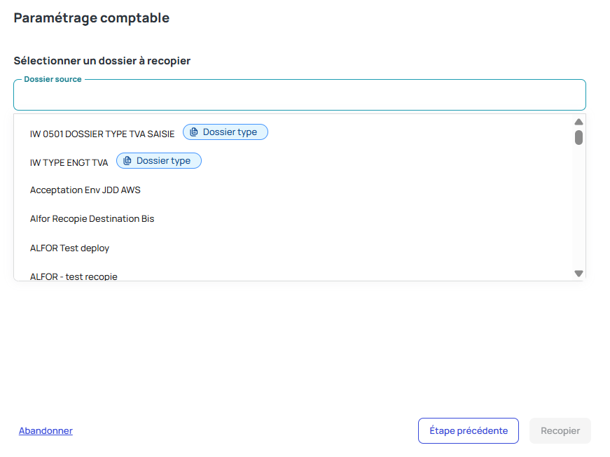 La recopie de dossier vous permet d’accélérer l’initialisation du paramétrage comptable en réutilisant la configuration d’un dossier existant. Cette option garantit une mise en route plus rapide et plus homogène, notamment lorsque vous appliquez les standards du cabinet (dossier type).