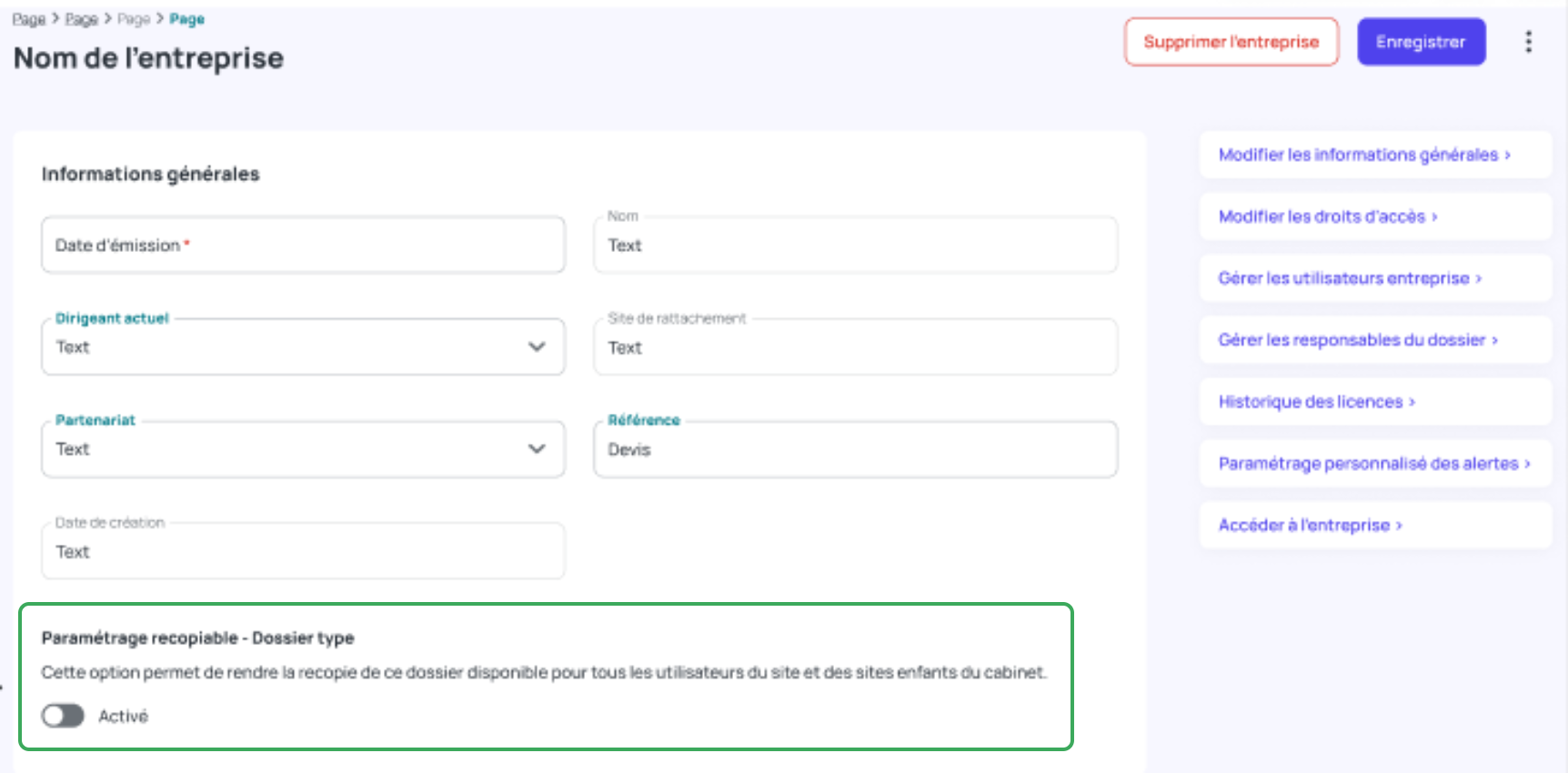 Vous pouvez définir un dossier type, directement depuis la fiche entreprise.