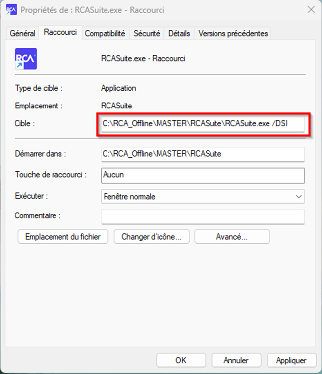 Créer un nouveau raccourci vers l’installateur de RCA Suite et vous allez devoir renseigner des paramètres spécifiques dans la cible en fonction de votre besoin.