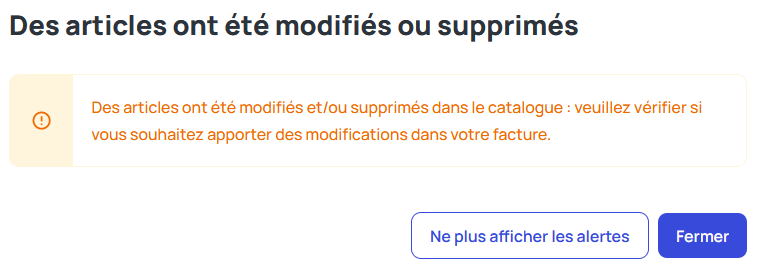 Les modifications effectuées s'appliqueront uniquement sur les nouveaux documents créés (factures et devis). Un message d’information vous indiquera que des articles ont été modifiés, lorsque vous serez sur l’édition d’un document en cours (état Brouillon) :