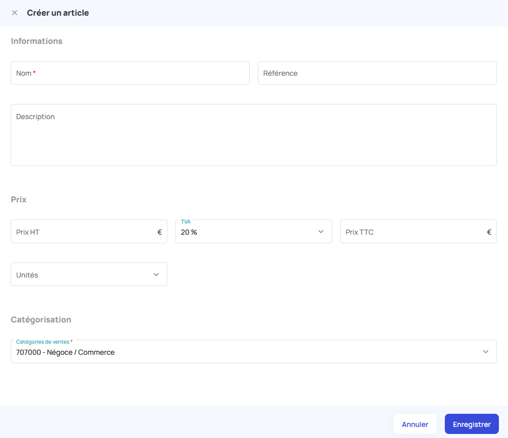 Renseignez également le prix HT ainsi que le taux de TVA. Le champ “prix TTC” sera automatiquement rempli (selon le calcul Prix HT*TVA). Vous pouvez sélectionner une unité pour votre article.