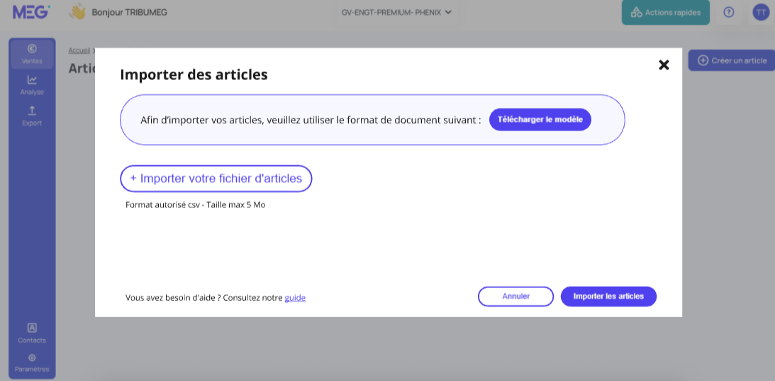 Afin de gagner du temps, vous avez également la possibilité d'importer en masse depuis un Excel vos articles. Pour cela, nous vous guidons :