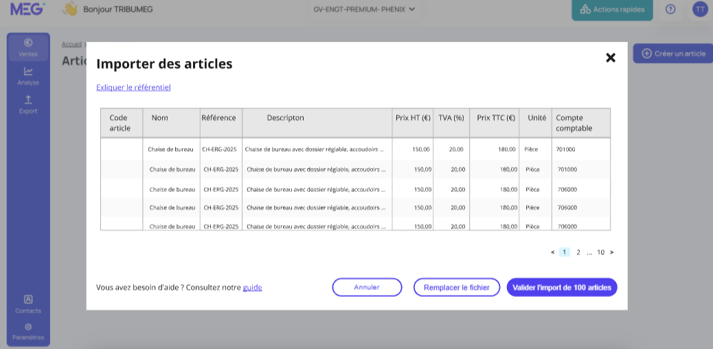 Rendez vous sur Ventes > Articles. Une pop-in s'affiche vous proposant l'import via Excel.