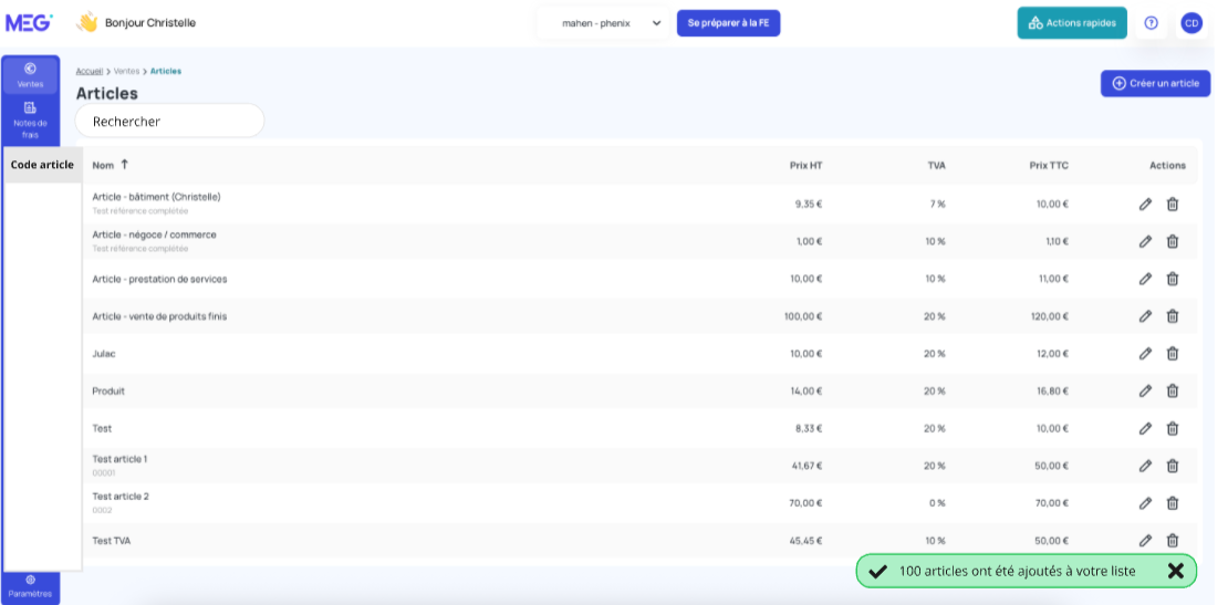 Pour gérer vos articles, rendez-vous dans Ventes >> Articles. Vous y retrouverez alors votre liste d’articles.