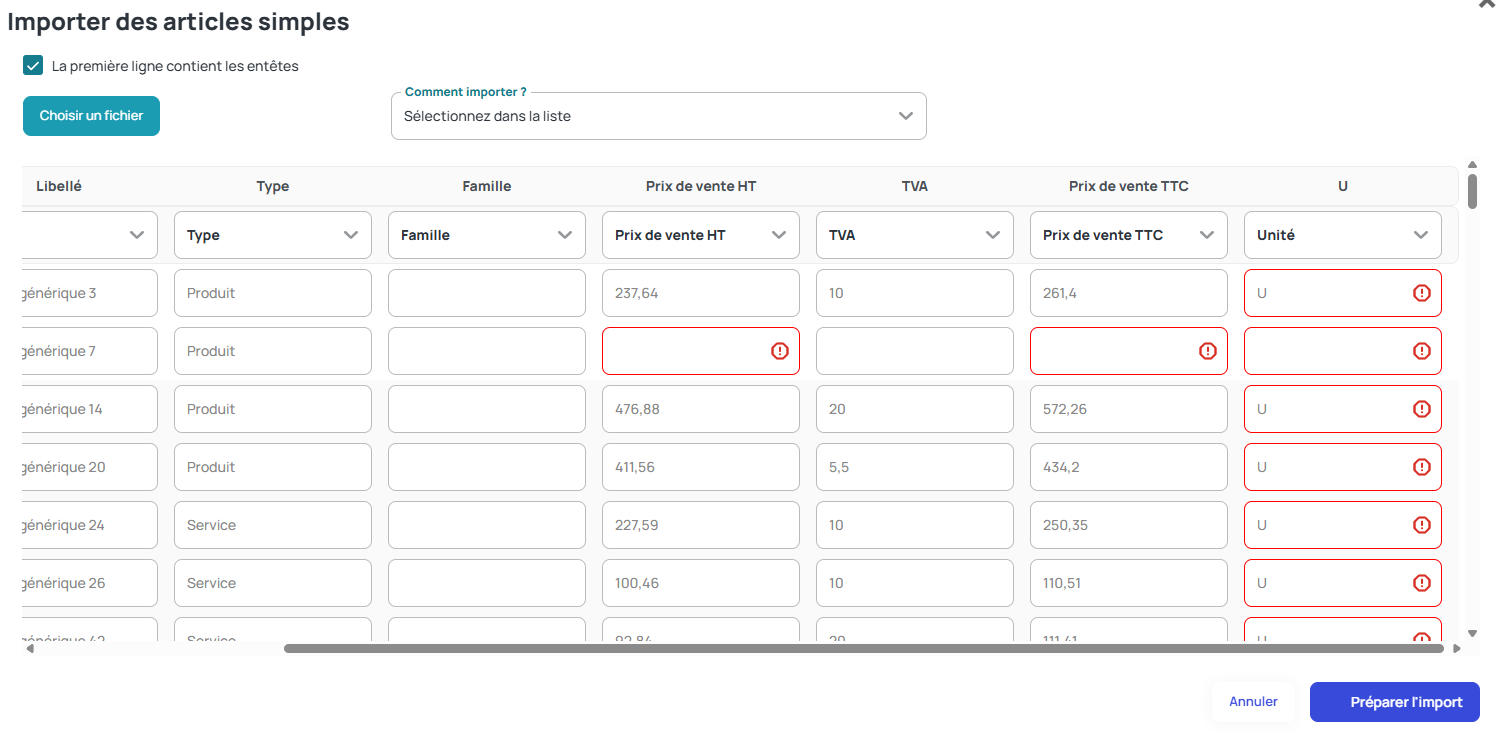 Contrôle des unités Afin que votre import puisse être validé, les unités de vos articles doivent correspondre aux libellés, symboles ou codes imposés. Pour vérifier que vous avez le bon format, n'hésitez pas à vous rendre sur la fiche pratique dédiée.