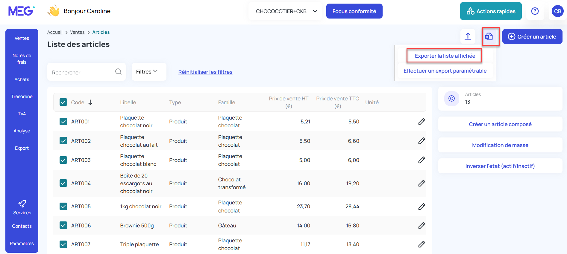 RAPPEL: EXPORTER DES ARTICLES - Cliquez sur le bouton à droite de la flèche d'export représentant un feuillet puis sur "Exporter la liste affichée"- Un fichier Excel se télécharge directement