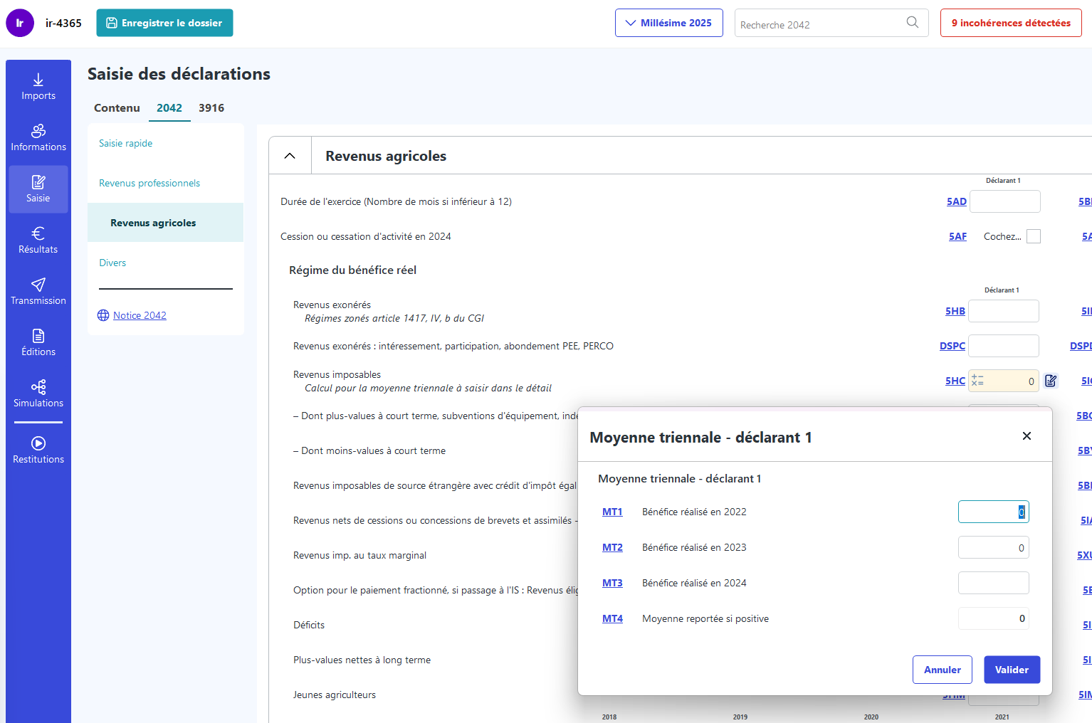 Les bénéfices et déficits de la moyenne triennale sont reportés automatiquement pour éviter toute double saisie.