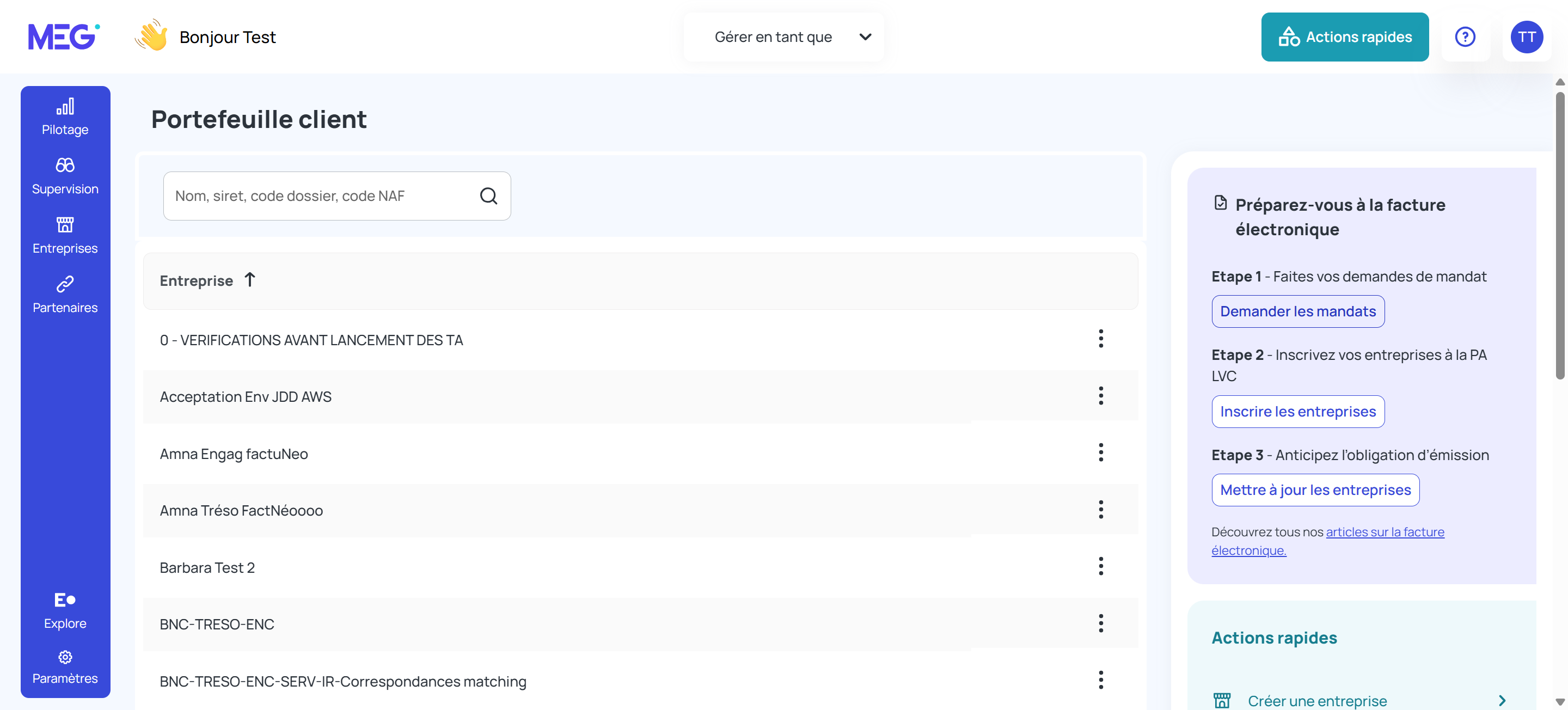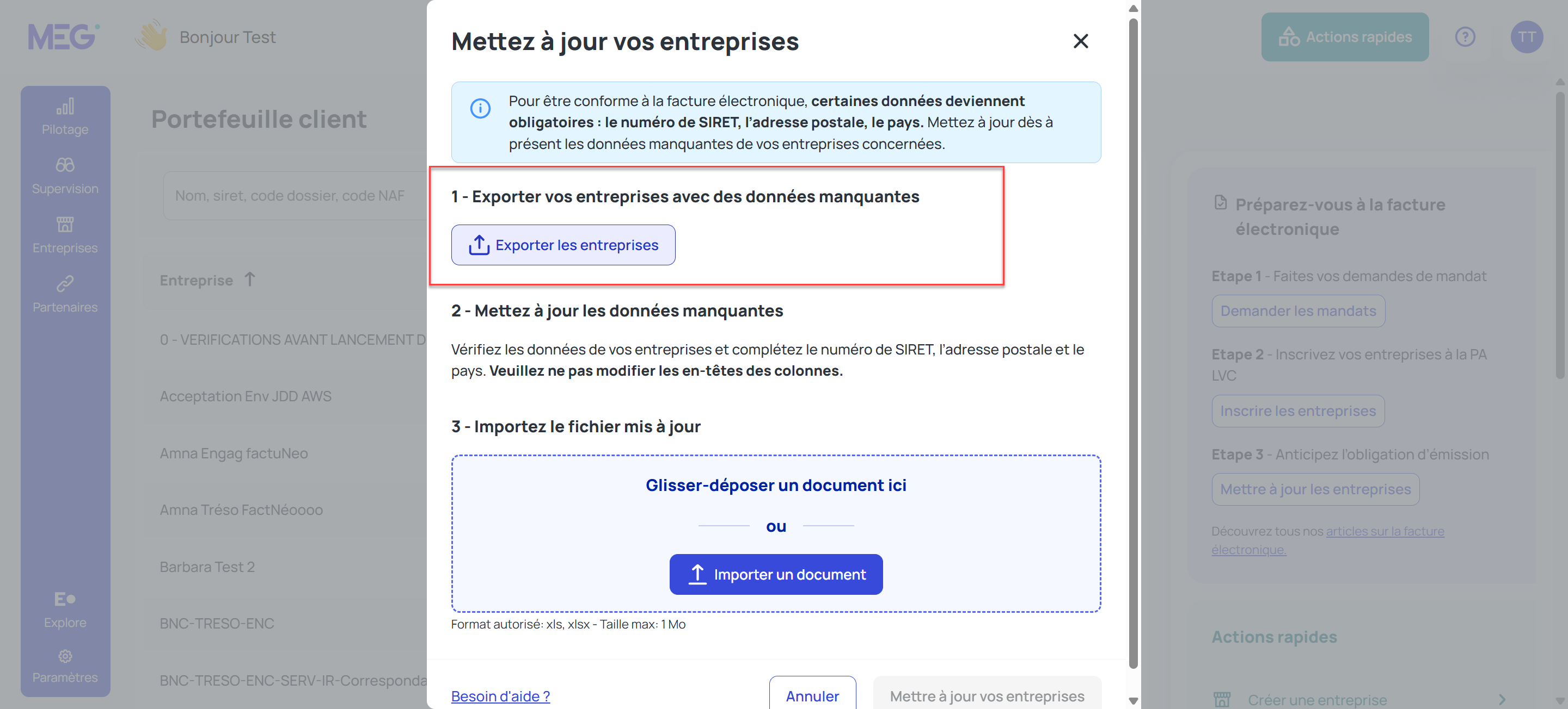 Tout d'abord, faites l'état des lieux en exportant les entreprises. Un fichier au format Excel se télécharge vous permettant de visualiser l'état d'avancement de vos clients sur un seul support.