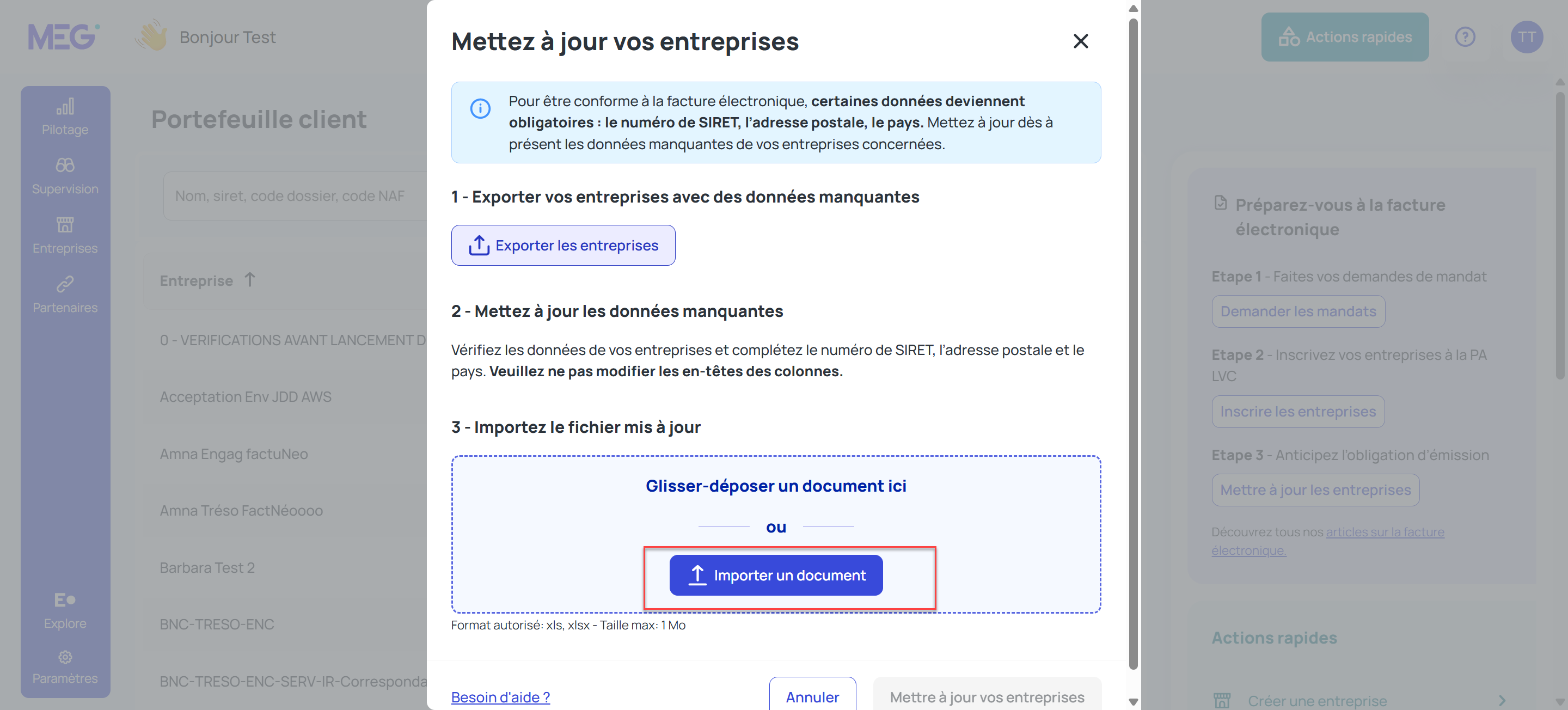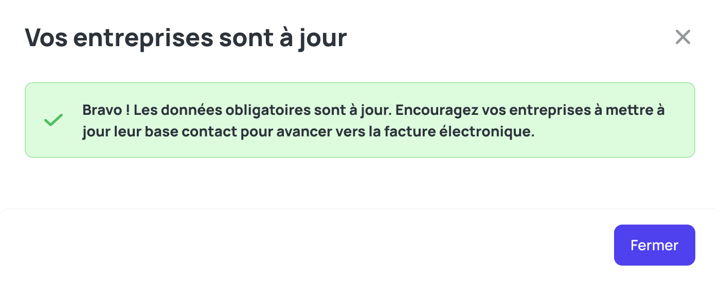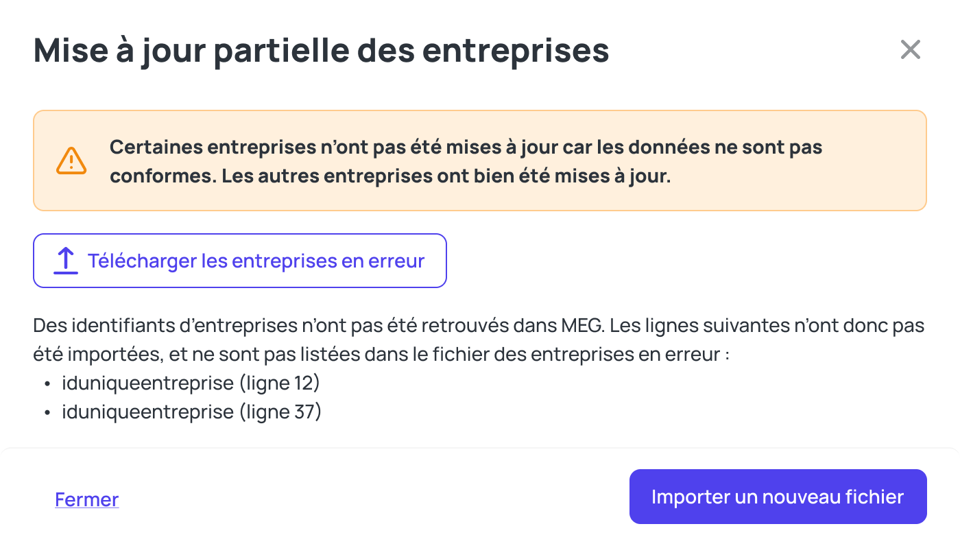 ![]() | Il y a des erreurs pour certaines entreprises, le fichier a été importé que partiellement. | Téléchargez les entreprises erreurs et effectuez les mises à jour indiquées avant de réimporter le fichier. |