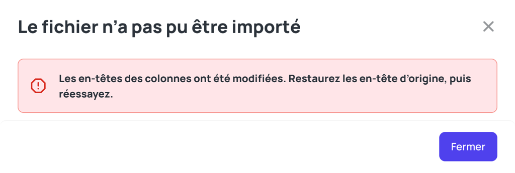 ![]() | Les colonnes ont probablement été modifiée, le fichier ne respecte pas le format. | Vérifiez la procédure ci-dessus et réimportez le fichier. |