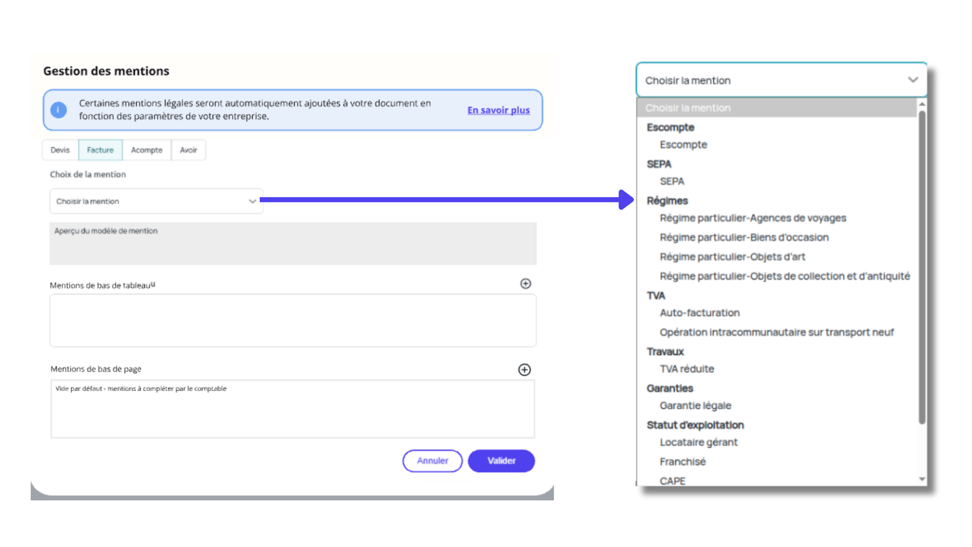 Elles ne sont pas obligatoires mais peuvent être ajoutées selon vos conditions commerciales, votre secteur ou vos spécificités.Elles sont accessibles depuis "Paramètres" > "Mise en page" > "Mentions légales" puis sélectionnez directement depuis le menu déroulant les mentions que vous souhaitez ajouter à vos PDF de factures.