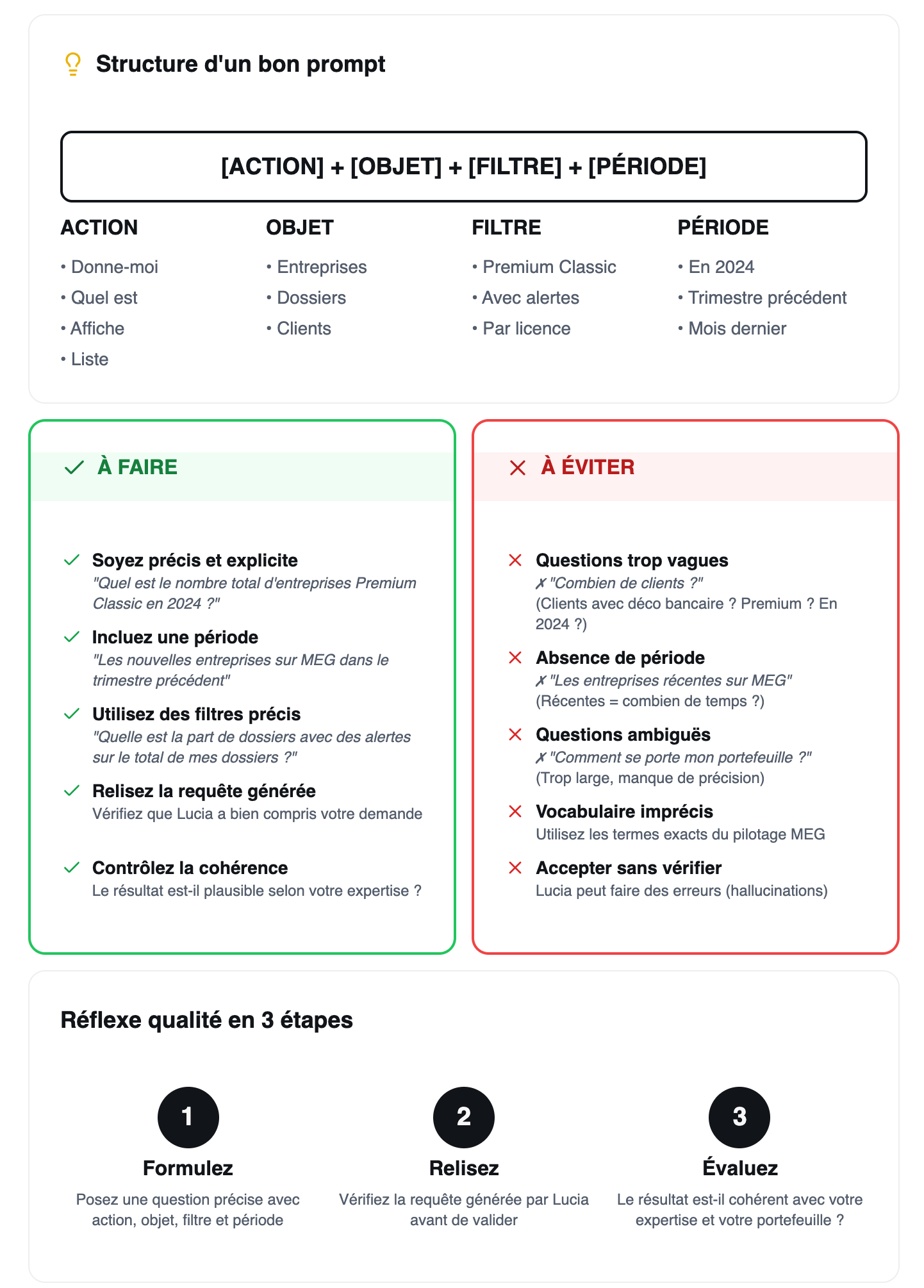 Points clés à retenir Lucia est un assistant, pas un remplaçant de votre expertise métier Plus votre question est précise, plus la réponse sera fiable Lucia peut se tromper (hallucinations) : vérifiez toujours les résultats Sécurité garantie : Lucia n'accède qu'aux données autorisées par vos droits MEG Lucia évolue grâce à vous : partagez vos retours pour l'améliorer
