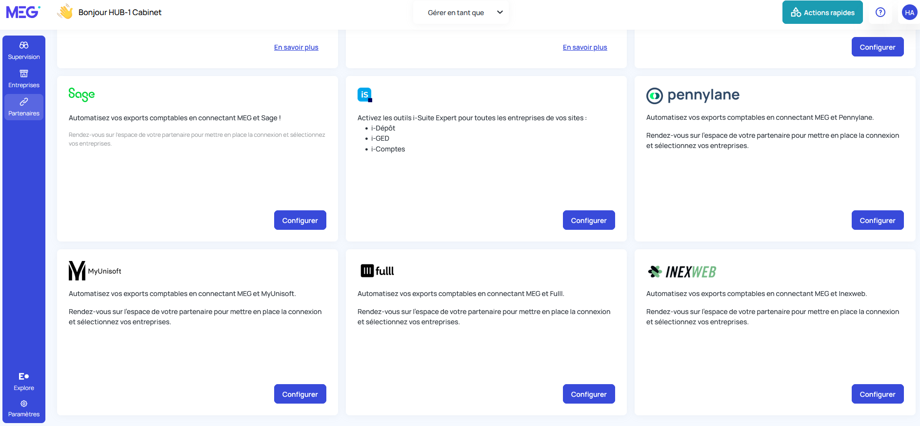 Depuis votre plateforme MEG, rendez vous sur l'onglet "Partenaires" à gauche de votre écran puis dans la tuile correspondante cliquez sur "Configurer".
