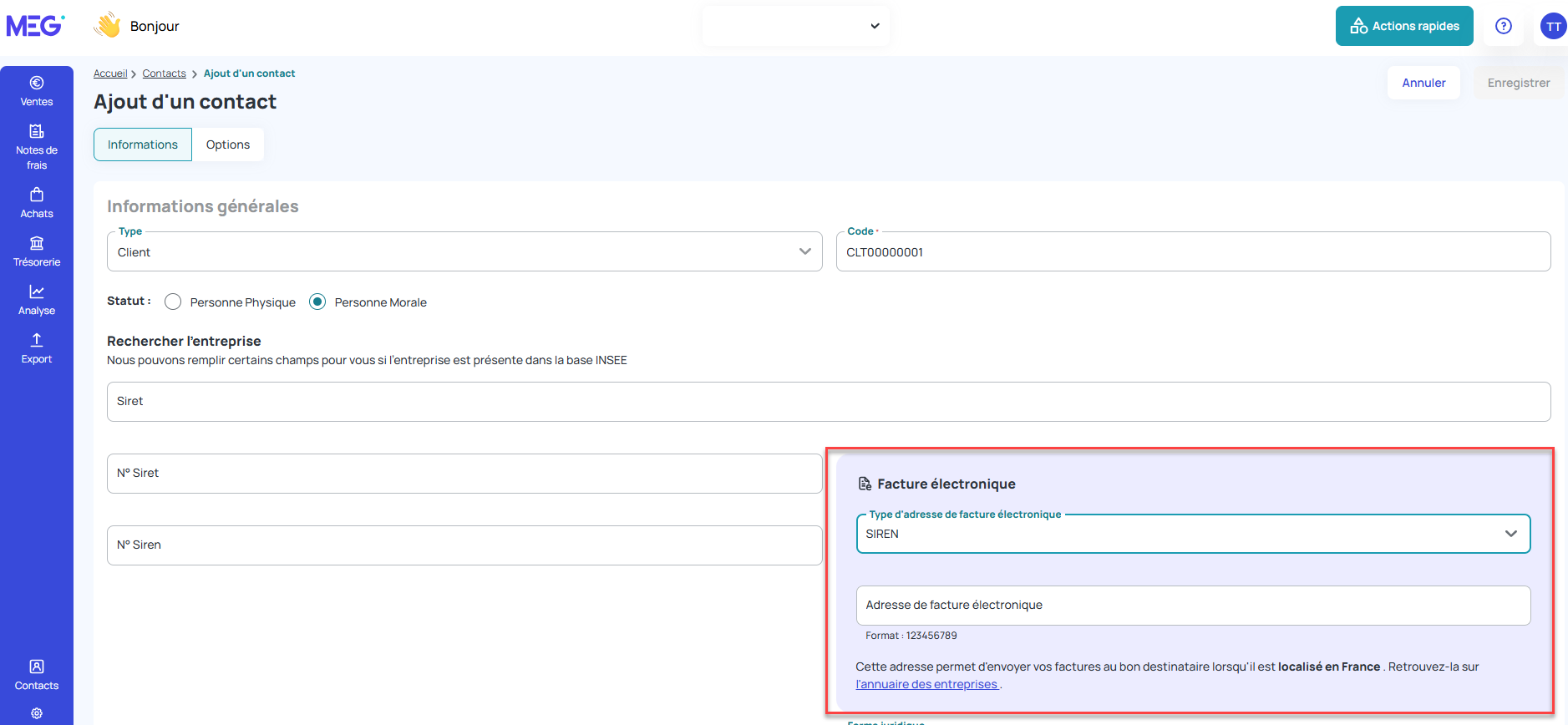 MEG ajoute désormais un bloc “Facture électronique” dans la fiche contact pour saisir cette information et contrôler sa cohérence avec le SIREN/SIRET.