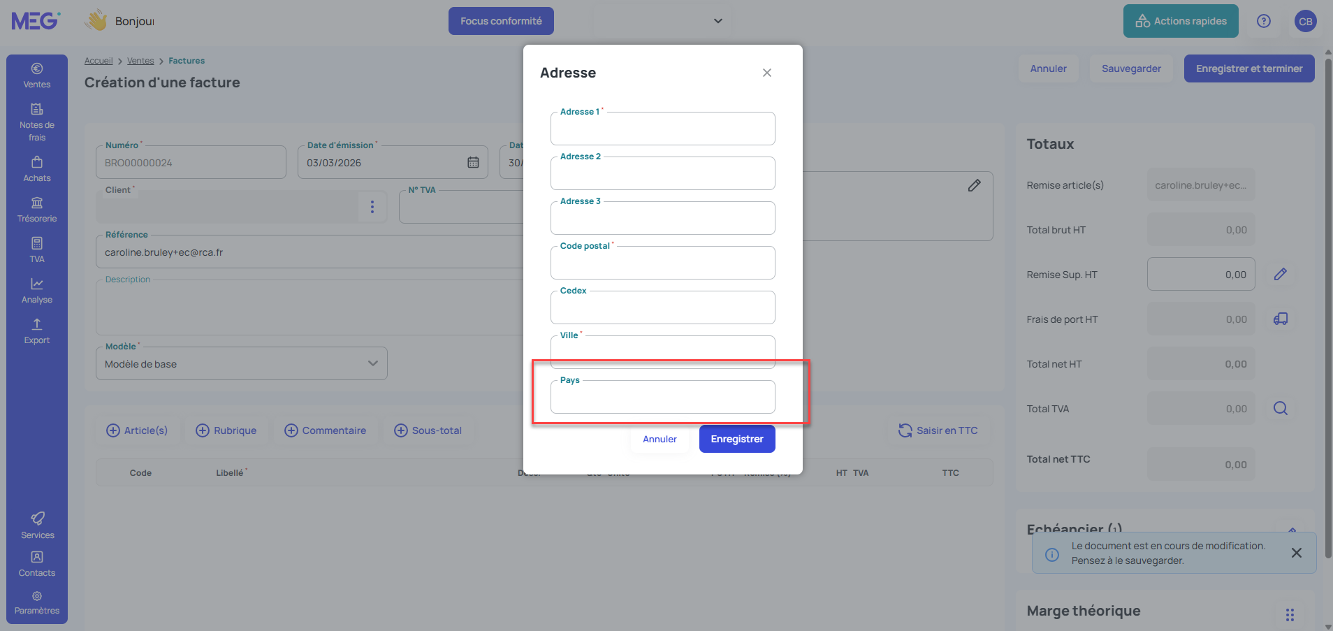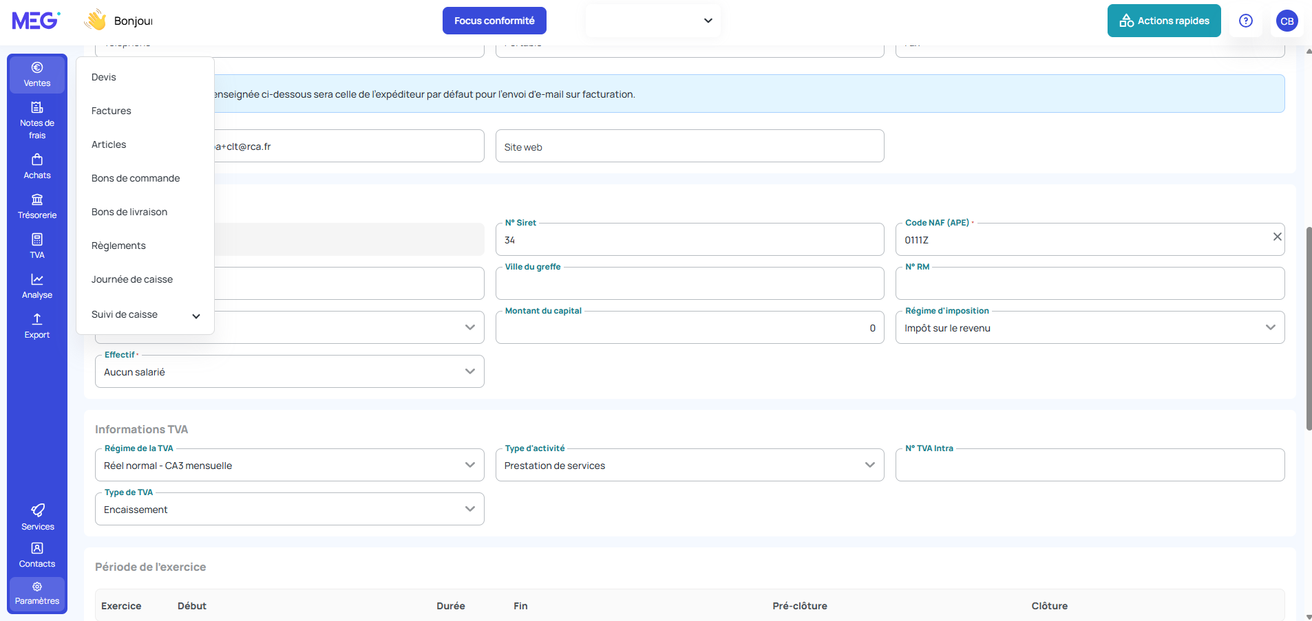 Nous poursuivons notre développement pour être parfaitement opérationnels pour la réforme de la facturation électronique. Pour cela, nous avons déployé de nouveaux éléments sur votre logiciel MEG.